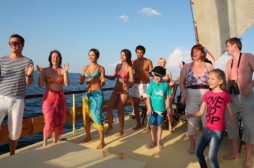 Соки, шампанское, прИзики:), пледики замерзшим, танцы, конкурсы и шикарные фото-кадры! Но с детьми всё же ехать не стала бы: никакой пошлости, просто технически неудобно: качка, борта с отверстиями как раз для ребенка, в открытое море опять-таки с детем не полезешь купаться, а НАДО! |