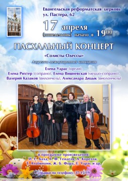 Дорогие друзья, приглашаем Вас на Пасхальный концерт на Пастера. Исполнители ансамбль «Солисты Одессы» Елена Удрас (орган), Елена Рихтер (сопрано), Елена Вишневская (меццо-сопрано), Валерий Казаков и Александра Дидык (виолончель). В программе прозвучат произведения И.С. Баха, Г.Ф. Генделя, А. Корелли, Т. Альбинони. Концерт состоится 17 апреля (понедельник) 19:00 в реформатской церкви на Пастера, 62. Телефон для справок 37-15-19