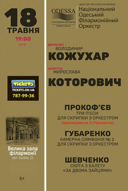 18 мая в 19:00 состоится концерт Национального одесского филармонического оркестра. В программе концерта Три пьесы для скрипки с оркестром С. Прокофьева («Монтекки и Капулетти», «Вальс Золушки», марш из оперы «Любовь к трем апельсинам») и Камерная симфония № 2 для скрипки с оркестром украинского композитора Виталия Губаренко в исполнении солистки Мирослава Которович. А также в концерте прозвучит музыка к балету «За двумя зайцами» заслуженного деятеля искусств Украины Юрия Шевченко. Дирижер — народный артист Украины Владимир Кожухарь.